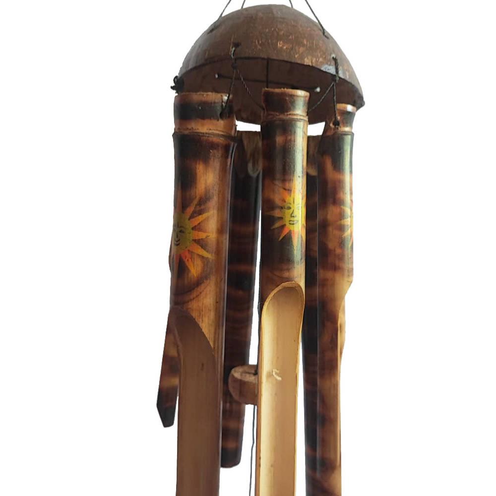 These bamboo chimes are patterned with faint burnt swirls, and have warm and bright smiley suns painted on each chime.