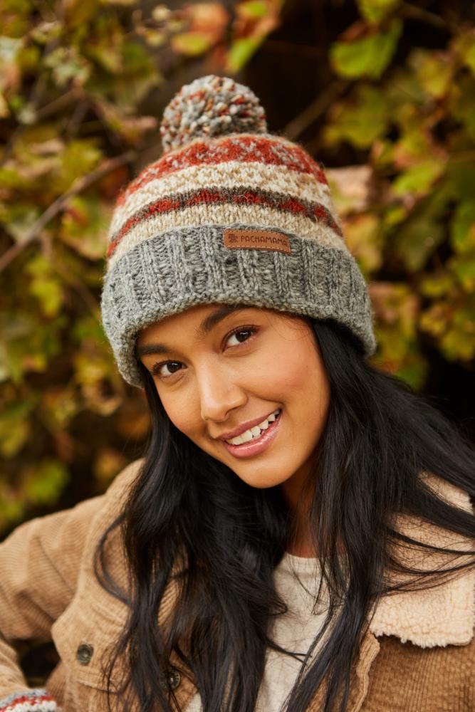 Women's hand knitted wool bobble hat. Made using traditional patterns. The colours will always be the same but the patterns and sequence may change depending on the knitter. Each one will be a bit different. Beautifully hand made by skilled knitters.