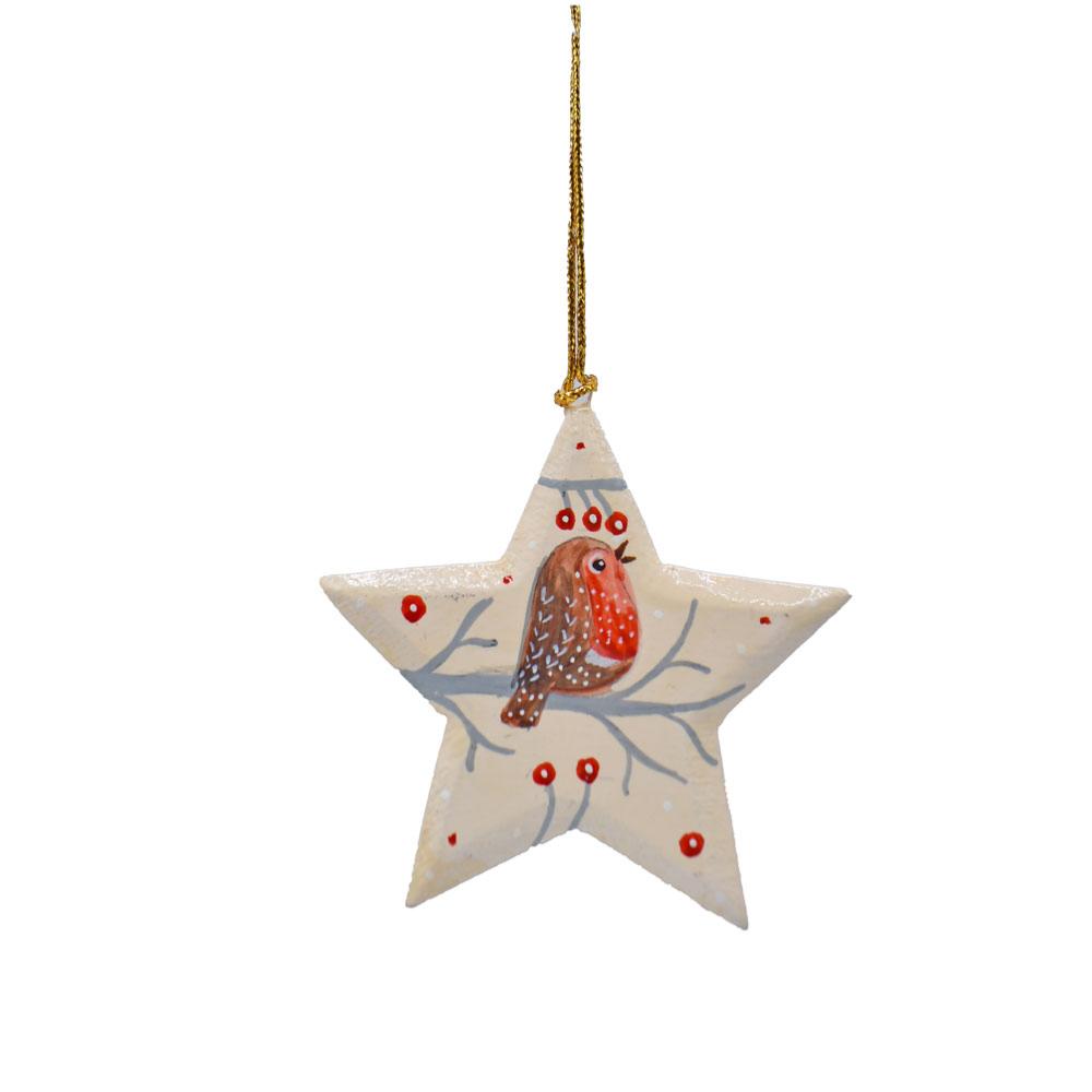 • Hanging decoration, robin on star, papier mâché 10.5cm