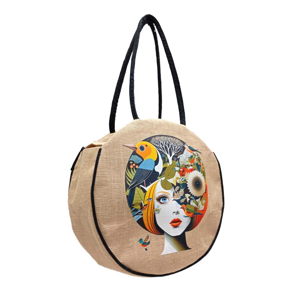 Jute Circular Bag with Zip Birds + Face Forward