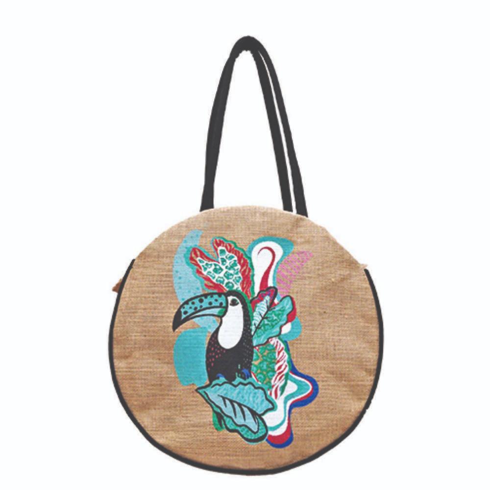 Jute Circular Bag with Zip Birds + Face to Right