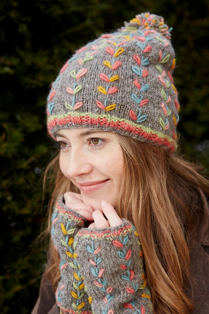 This Kylemore bobble beanie hat is beautifully embroidered with simple leaf patterns inspired by nature. It is handknitted in wool in autumn hues and hand crafted with care. The fleece lining is sure to keep you warm and cosy.