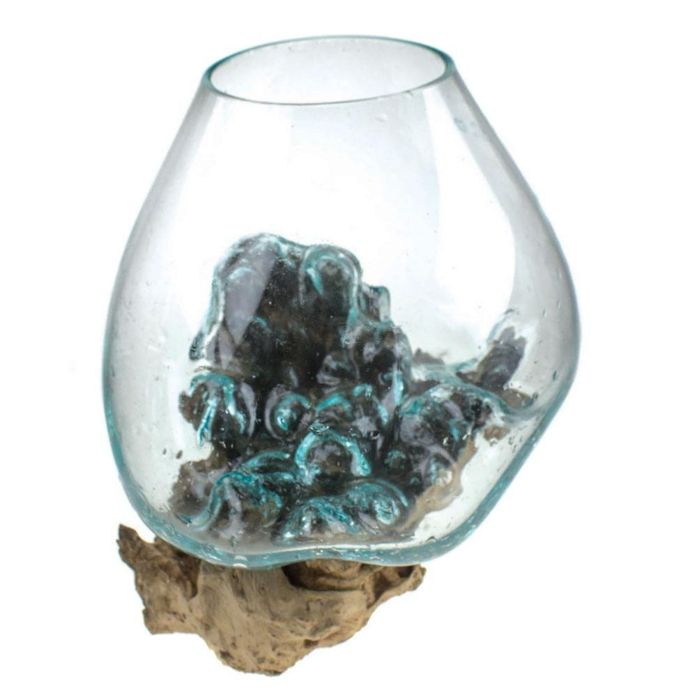 Each piece is unique, the glass melted to hug the natural contours of the wood on which it perches.