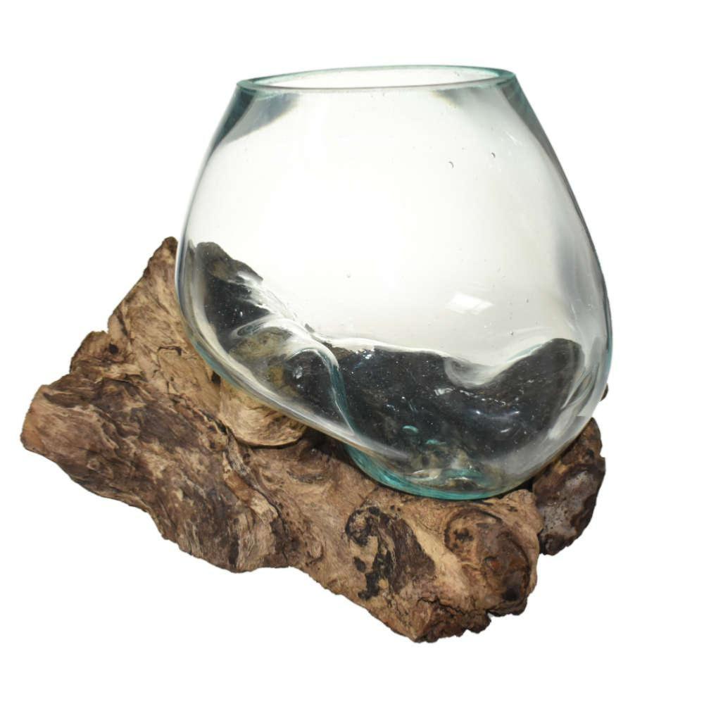 Each piece is unique, the glass melted to hug the natural contours of the wood on which it perches.