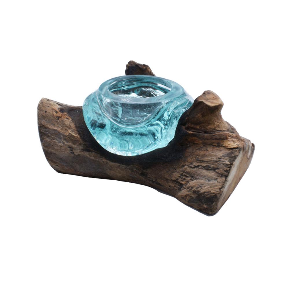 Each piece is unique, the glass melted to hug the natural contours of the wood on which it perches.