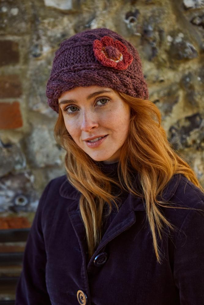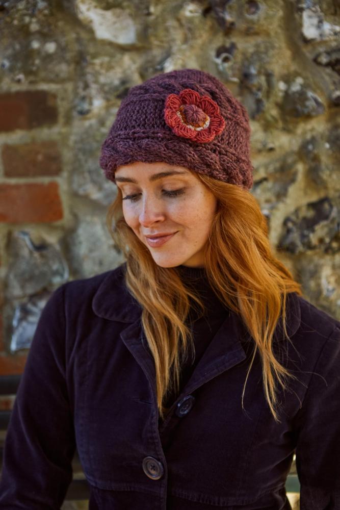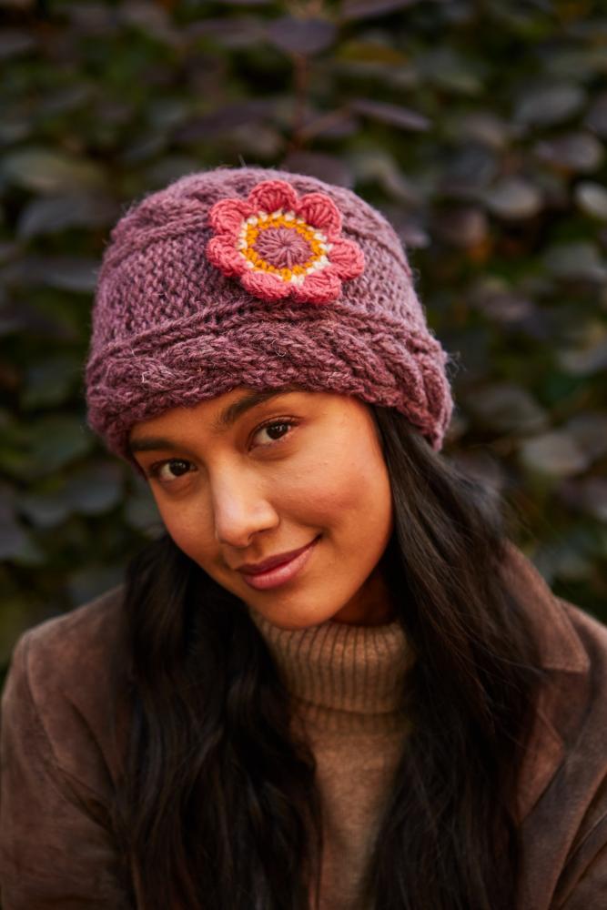 Handmade cable knit beanie hat with a crochet colourful flower.