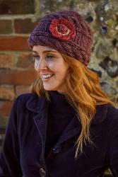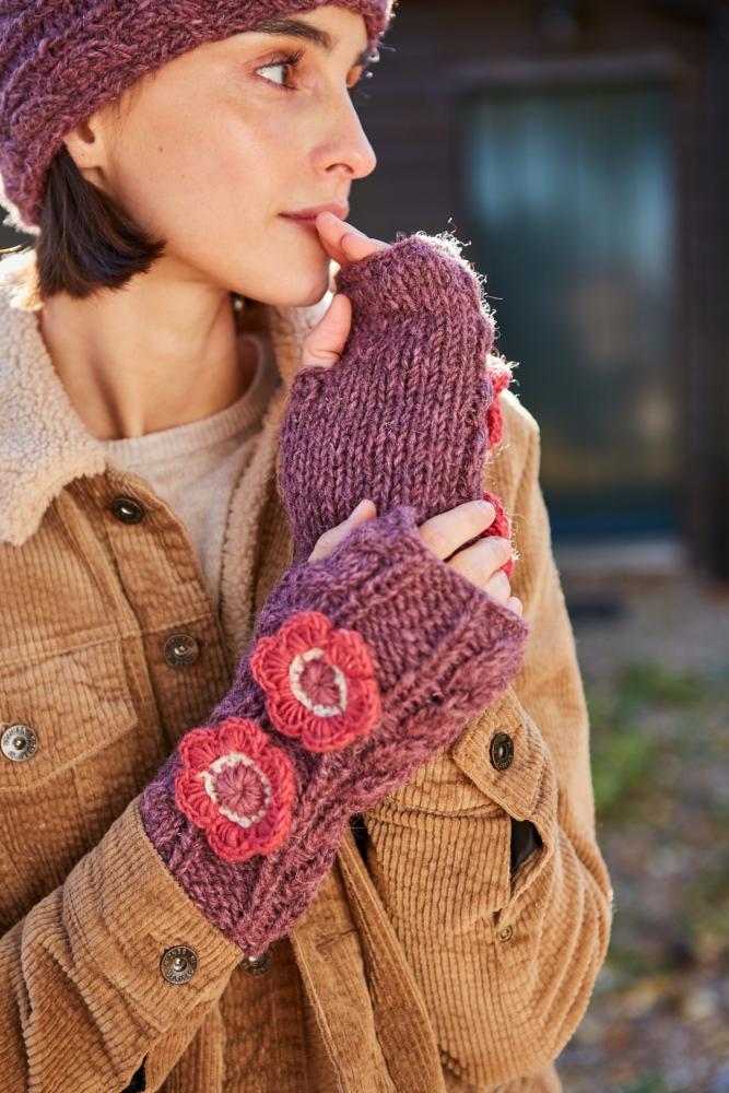 Handmade cable knit fingerless cloves with a crochet colourful flower.